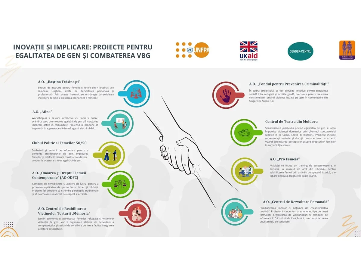 Nouă organizații din Moldova conduse de femei, membre ale Platformei pentru Egalitate de Gen, și-au unit forțele pentru a implementa proiecte dedicate promovării egalității de gen, combaterii stereotipurilor de gen, și susținerii femeilor și fetelor în prevenirea și răspunsul la violența în baza de gen. Aceste proiecte sunt parte dintr-o inițiativă amplă care își propune să creeze un impact semnificativ în comunitățile locale prin diverse activități de informare, educare și susținere.